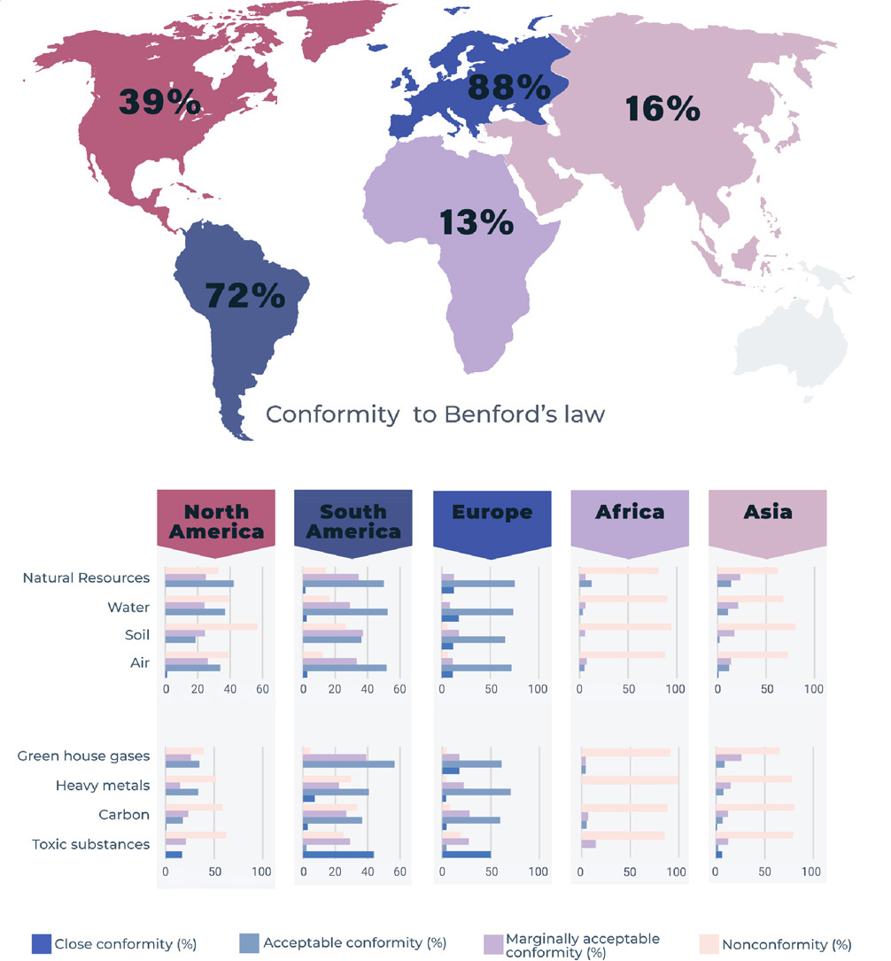 In the study authors performed the Benford’s law conformity tests (first digit) on all numerical data in ecoinvent, focusing on individual compartments (air, water, soil, and natural resources) and environmental elementary flows (carbon, toxic substances, greenhouse gases, and heavy metals), and discrepancies across continents were examined.