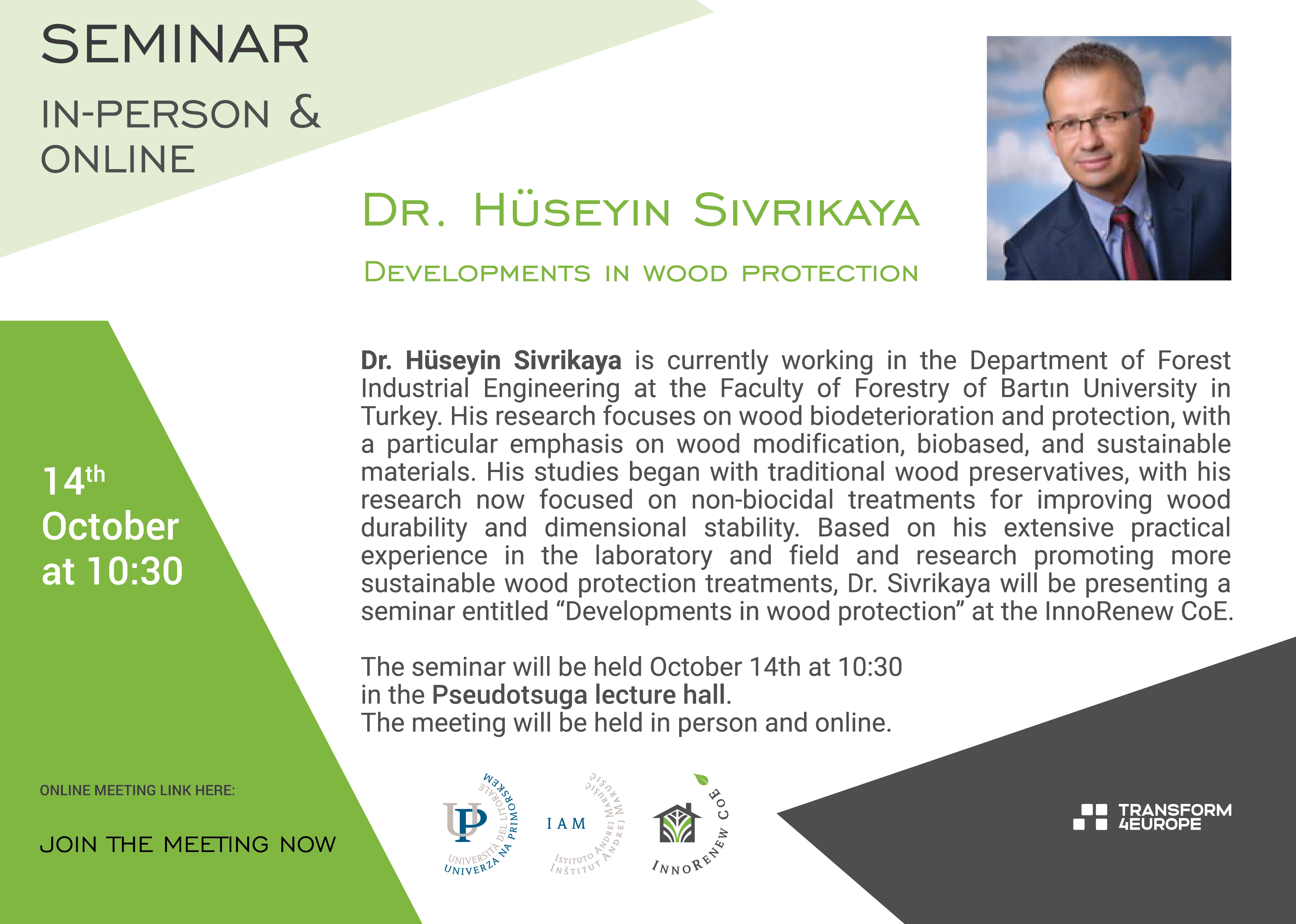 InnoRenew CoE will be hosting Dr. Hüseyin Sivrikaya who is currently working in the Department of Forest Industrial Engineering at the Faculty of Forestry of Bartın University in Turkey.