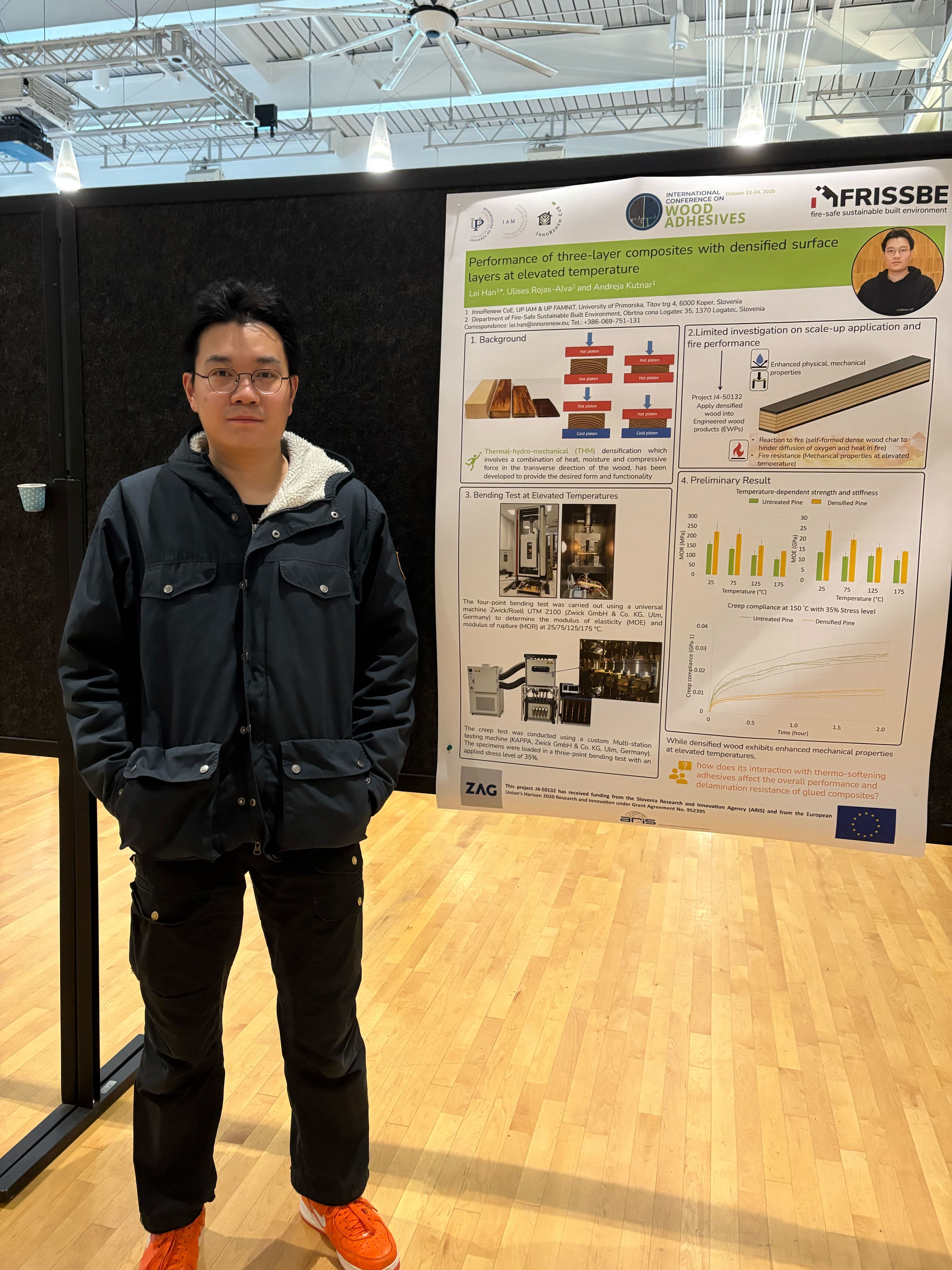 Lei Han took part at the poster session and presented the topic “Performance of three-layer composites with densified surface layers at elevated temperature”.