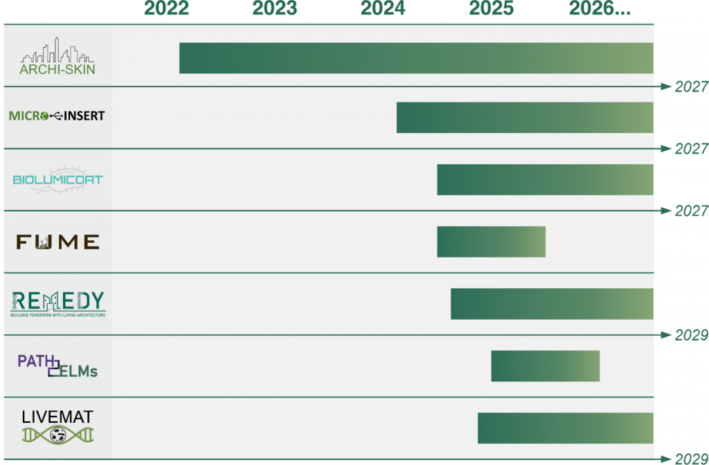 Figure 1. Timeline of Engineered Living Materials projects granted since 2022 at InnoRenew CoE/University of Primorska.