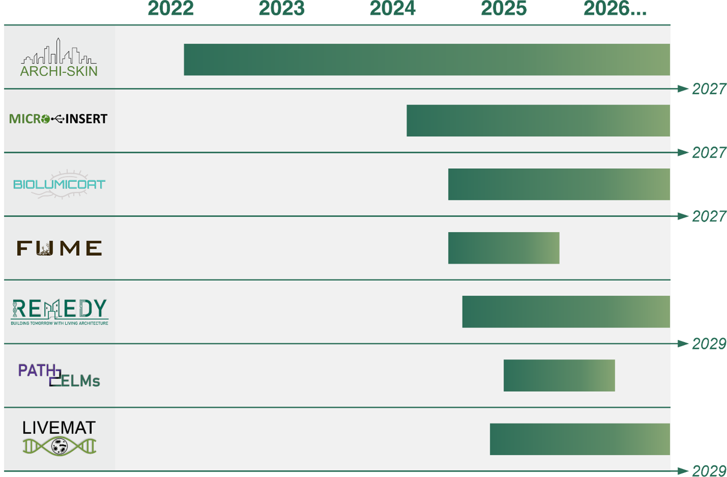Figure 1. Timeline of Engineered Living Materials projects granted since 2022 at InnoRenew CoE/University of Primorska.