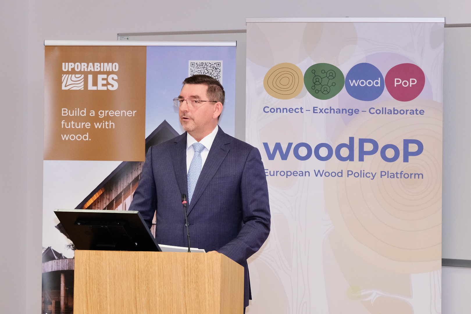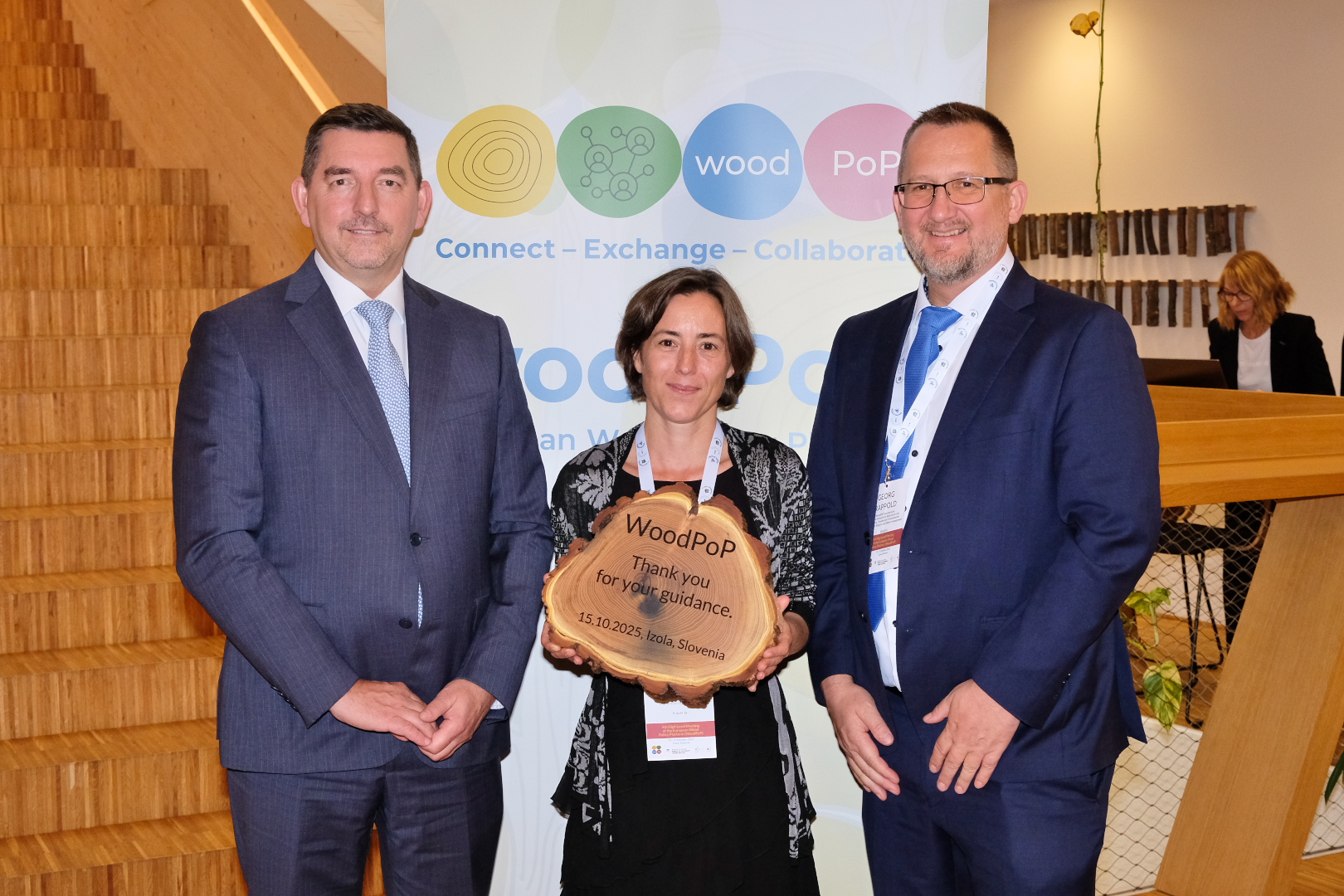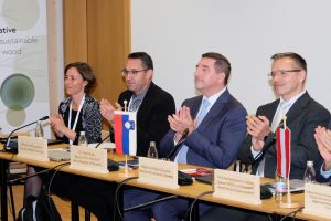 Dr. Aleš Musar, representing the Slovenian president Dr. Nataša Pirc Musar, emphasized the importance of wood in Slovenia and presented the new presidential office table as a best practice example. The table is demonstrating how Slovenian knowledge, design, craftsmanship, and the circular economy potential of the wood sector come together. He stated: “Wood is deeply woven into Slovenia’s identity and future. The new presidential office table is more than just furniture, it is a symbol of how Slovenian knowledge, design, and craftsmanship can come together to demonstrate the circular economy potential of our wood sector. By choosing wood, we are not only supporting local innovation and tradition, but also making a conscious step towards a healthier, more sustainable, and climate-friendly future for all.”