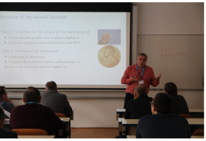 This year’s keynote speaker was prof. dr. Michael Bierlaire, from École Polytechnique Fédérale de Lausanne (EPFL). In his talk, he emphasized that choice behaviour is central to many real-world applications, especially in areas such as transportation planning and marketing. Classical choice models, based on random utility theory, assume that individuals choose the alternative that provides the highest utility. However, these models require the explicit enumeration of all possible alternatives, which becomes impractical when the choice set is large or complex.