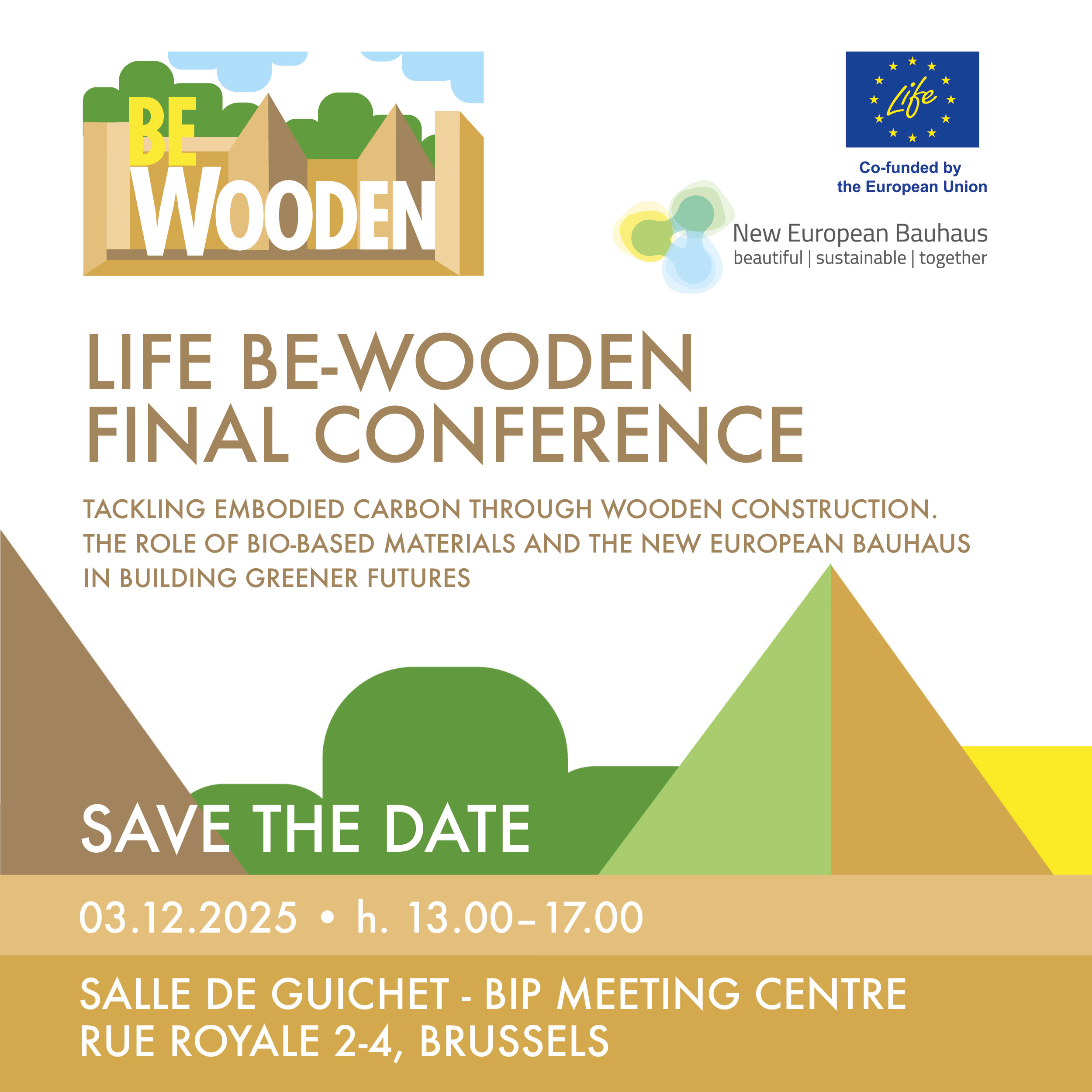 You are kindly invited to the final conference of the LIFE Be-WoodEN project, “Tackling embodied carbon through wooden construction. The role of bio-based materials and the New European Bauhaus in building greener futures”, which will be held on 3 December 2025, in Brussels, at the Salle de Guichet, BIP Meeting Centre, Rue Royale 2-4.