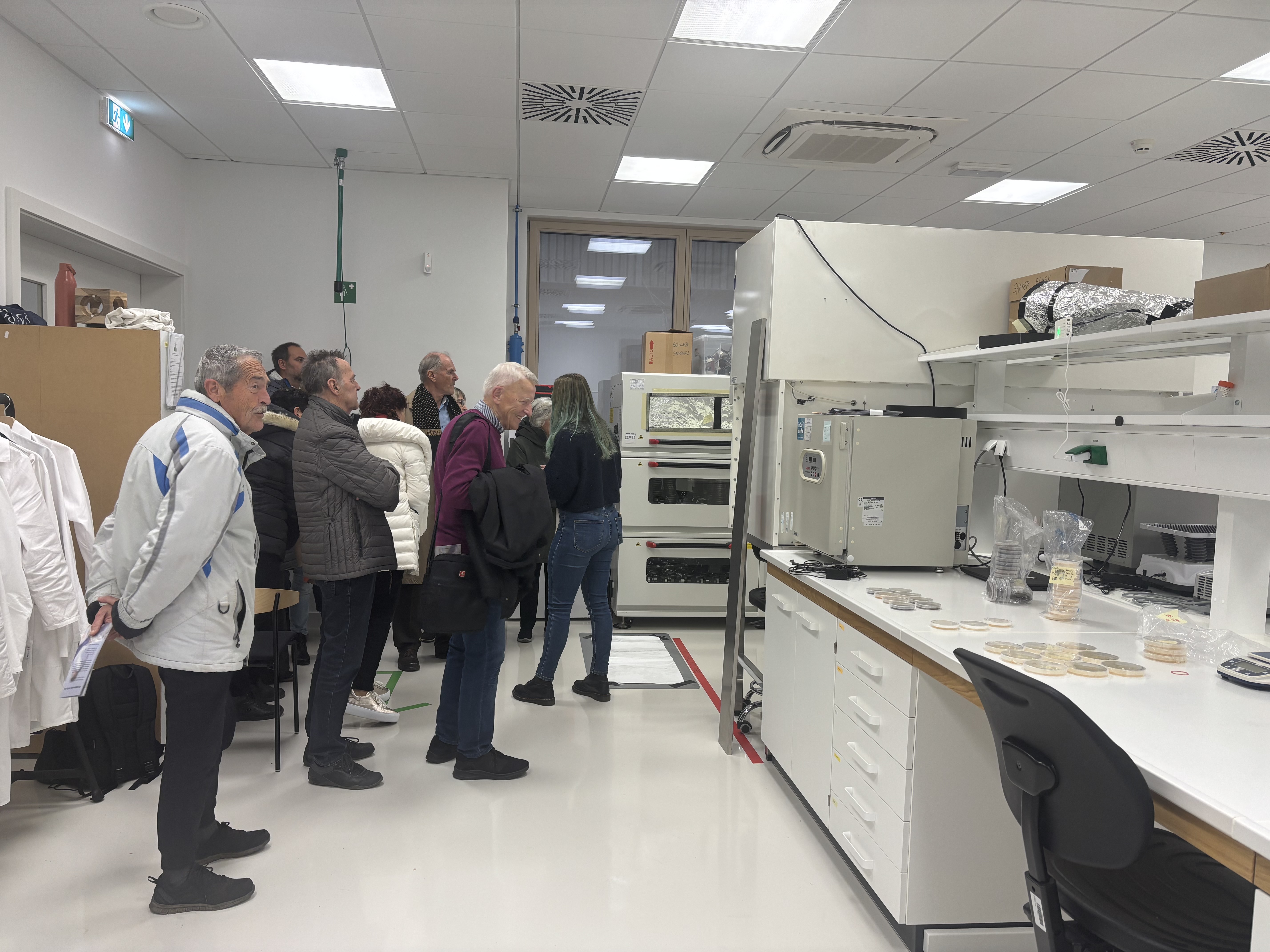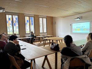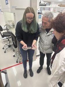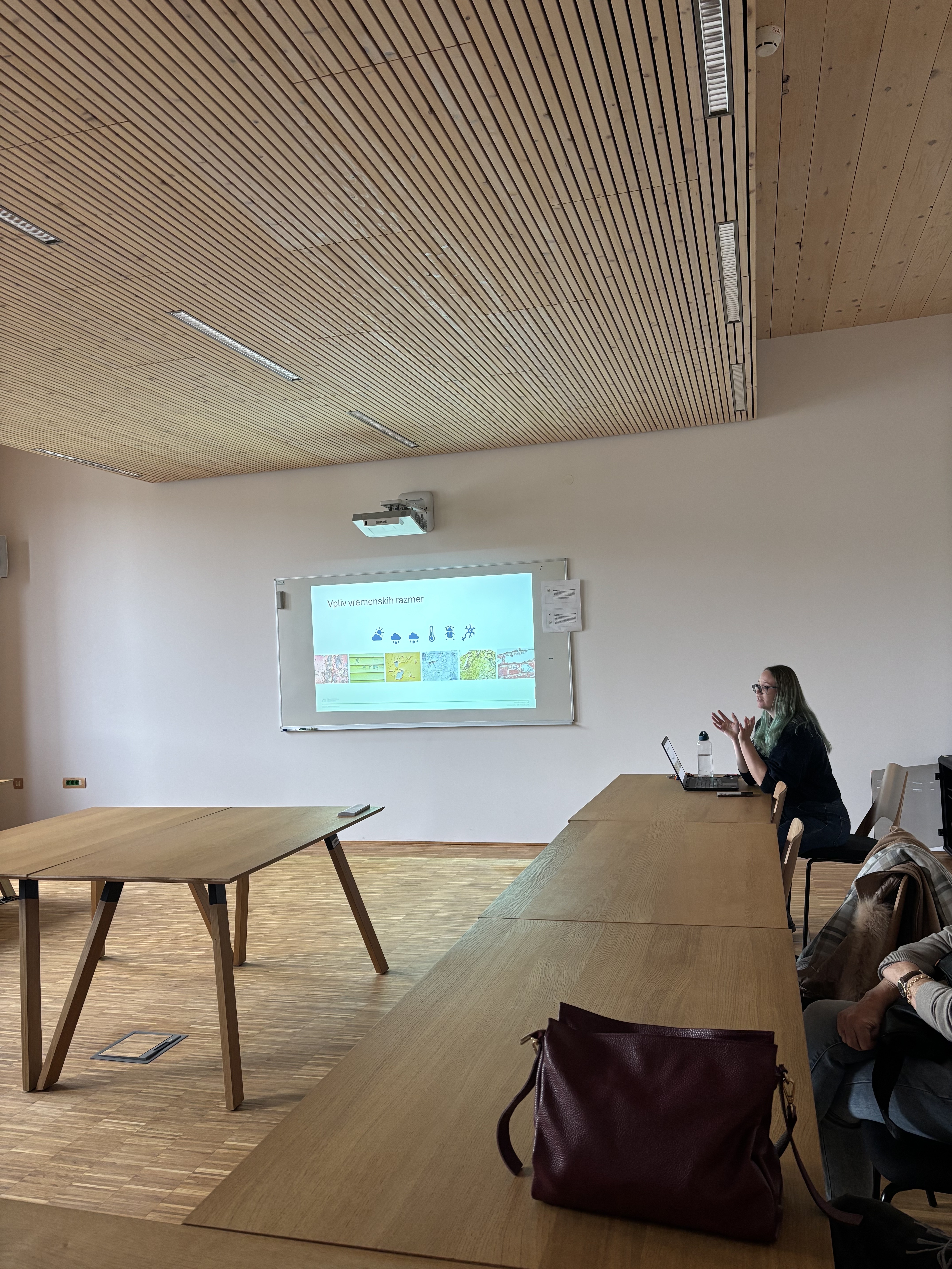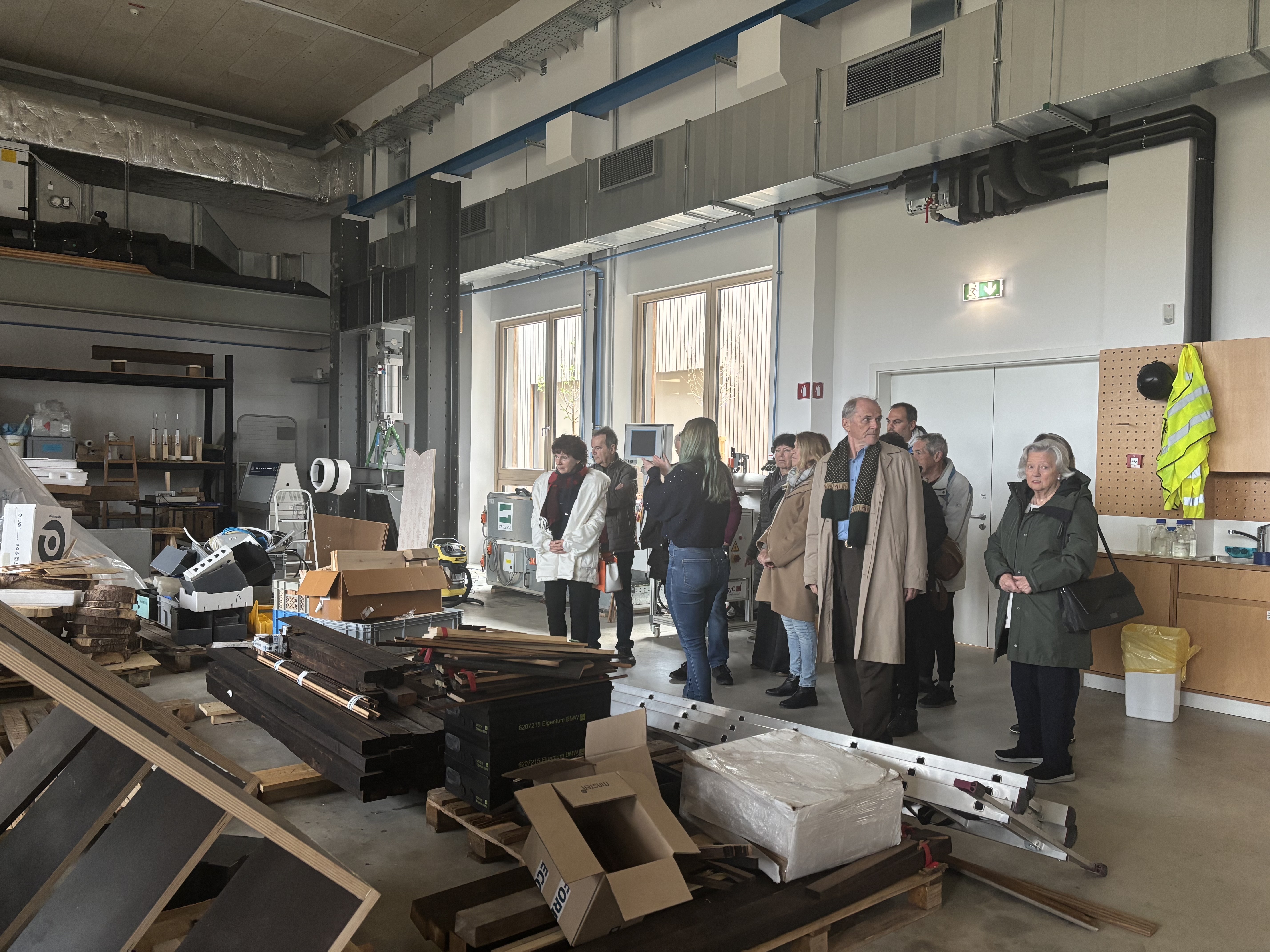 She presented the ARCHI-SKIN project, which develops bioinspired protective coating based on living fungal biofilms and other natural components. She also explained the concept of Engineered Living Materials and probiotic architecture researched in the REMEDY project. Additionally, she outlined other ongoing projects at InnoRenew CoE. Then they toured the building and laboratories, where she introduced interesting aspects of the architecture and explained the main functions of the laboratories.