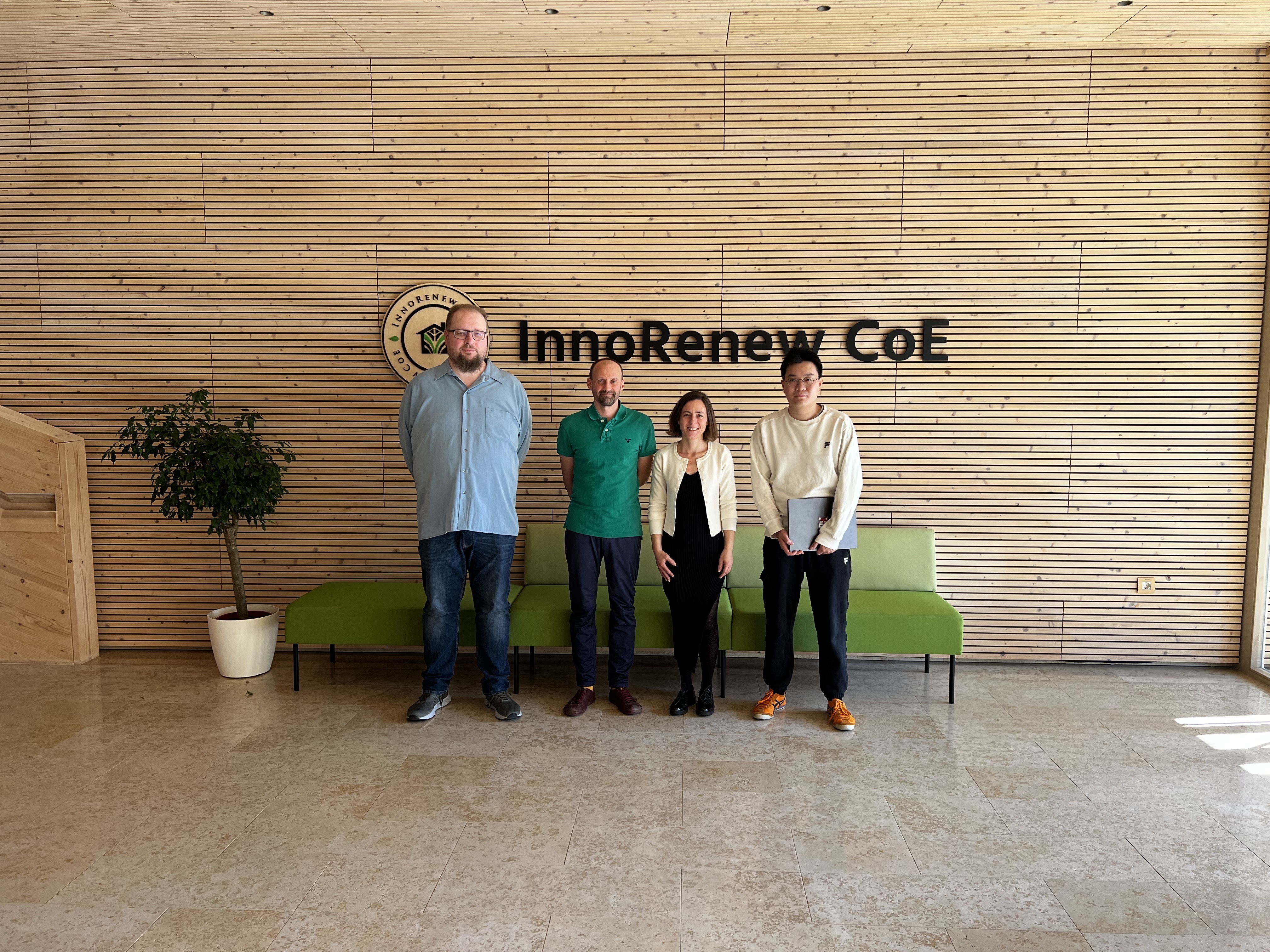 Dr. Andreja Kutnar, direktorica v InnoRenew CoE, in Lei Han, raziskovalec, sta na inštitutu sprejela Tuomasa Hihnalo iz podjetja Lappset ter profesorja Rautkarija Laurija iz univerze Aalto university.