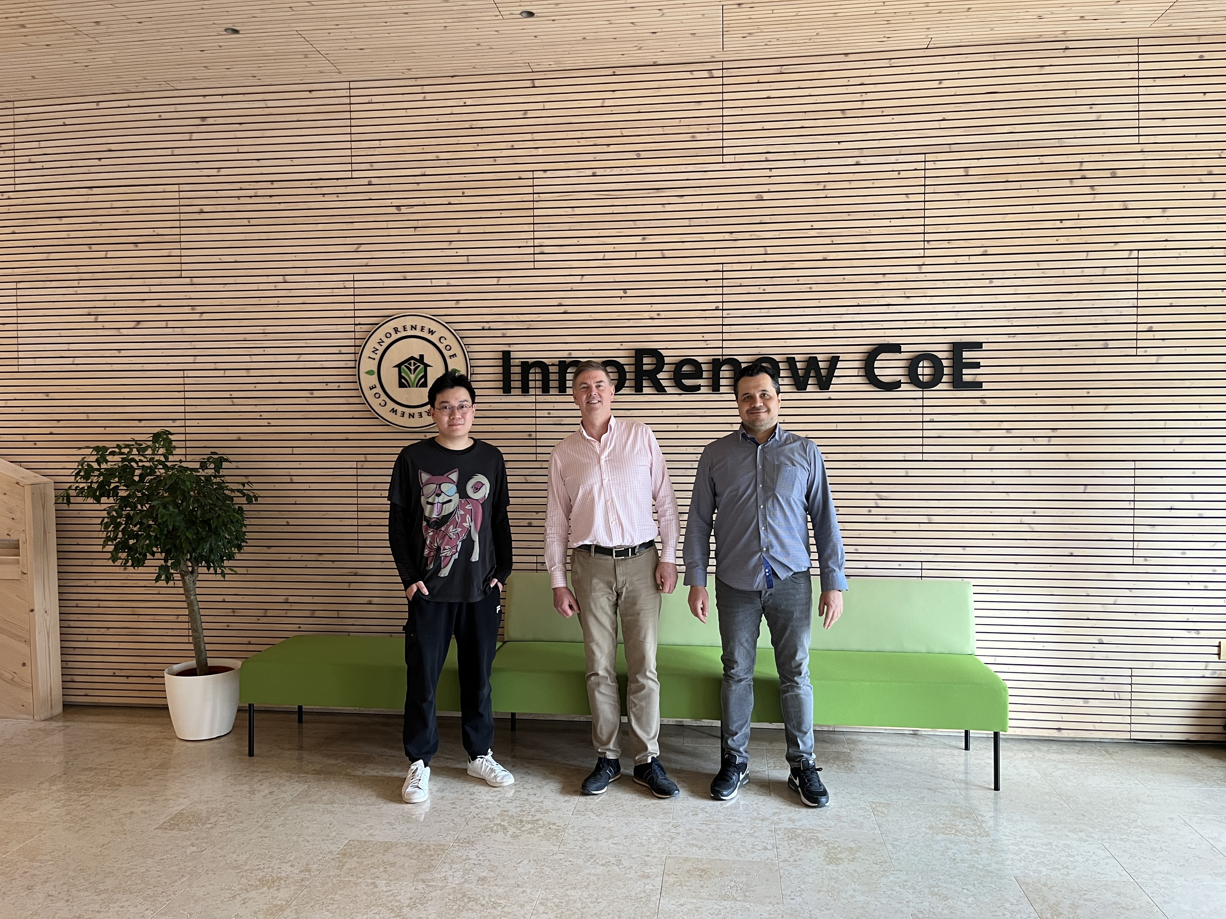 Lei Han, raziskovalec v InnoRenew CoE, je v stavbi inštituta sprejel Panagiotisa Manoudisa in Martina Dickieja iz podjetja Zero Ignition.