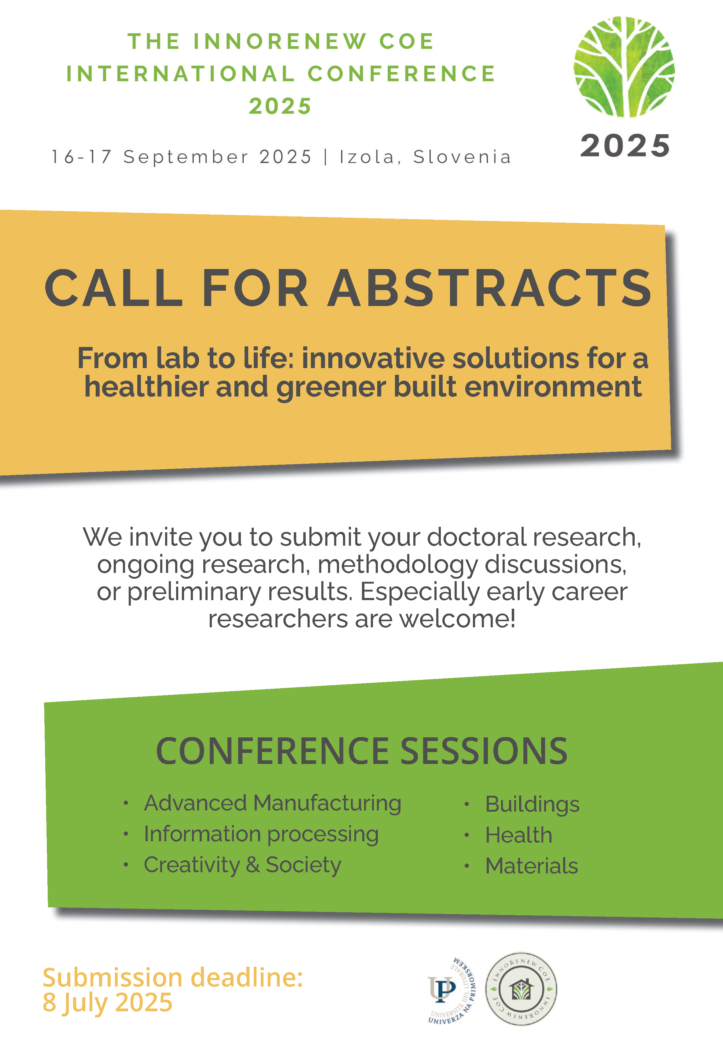 Mednarodna konferenca InnoRenew CoE 2025 (IRIC2025) z naslovom “From lab to life: innovative solutions for a healthier and greener built environment” vabi k oddaji povzetkov in aktivnemu sodelovanju na konferenci do 8. julija 2025.